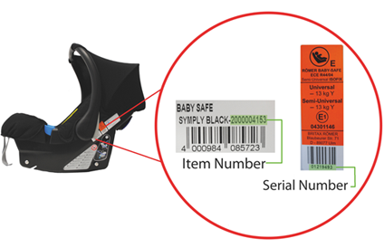 Kérjük, vegye fel a kapcsolatot ügyfélszolgálatunkkal ezzel kapcsolatban. Kérni fogjuk a cikkszámot és a sorozatszámot. Ezek a matricák a babahordozó bal oldalán találhatók (a gyermek irányából nézve), a fogantyú csuklópántja mögött.
